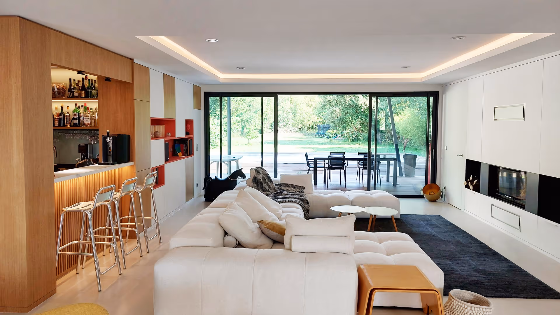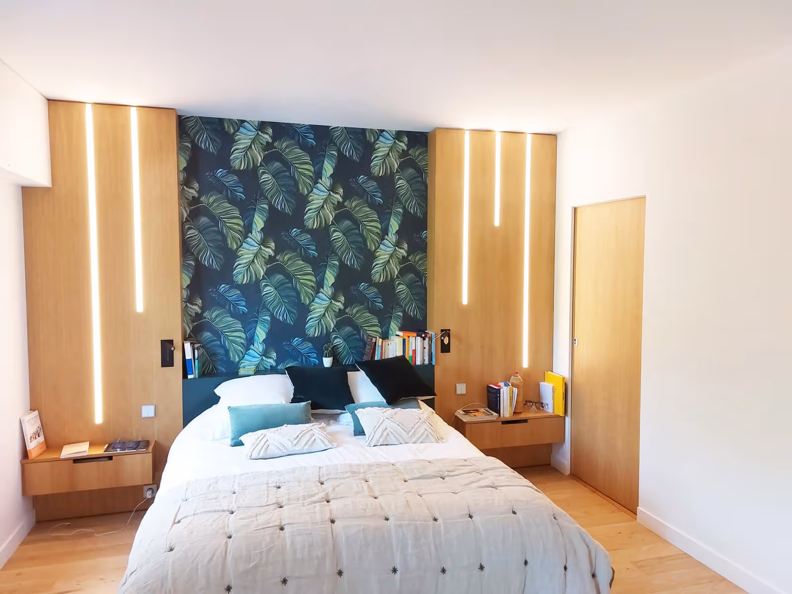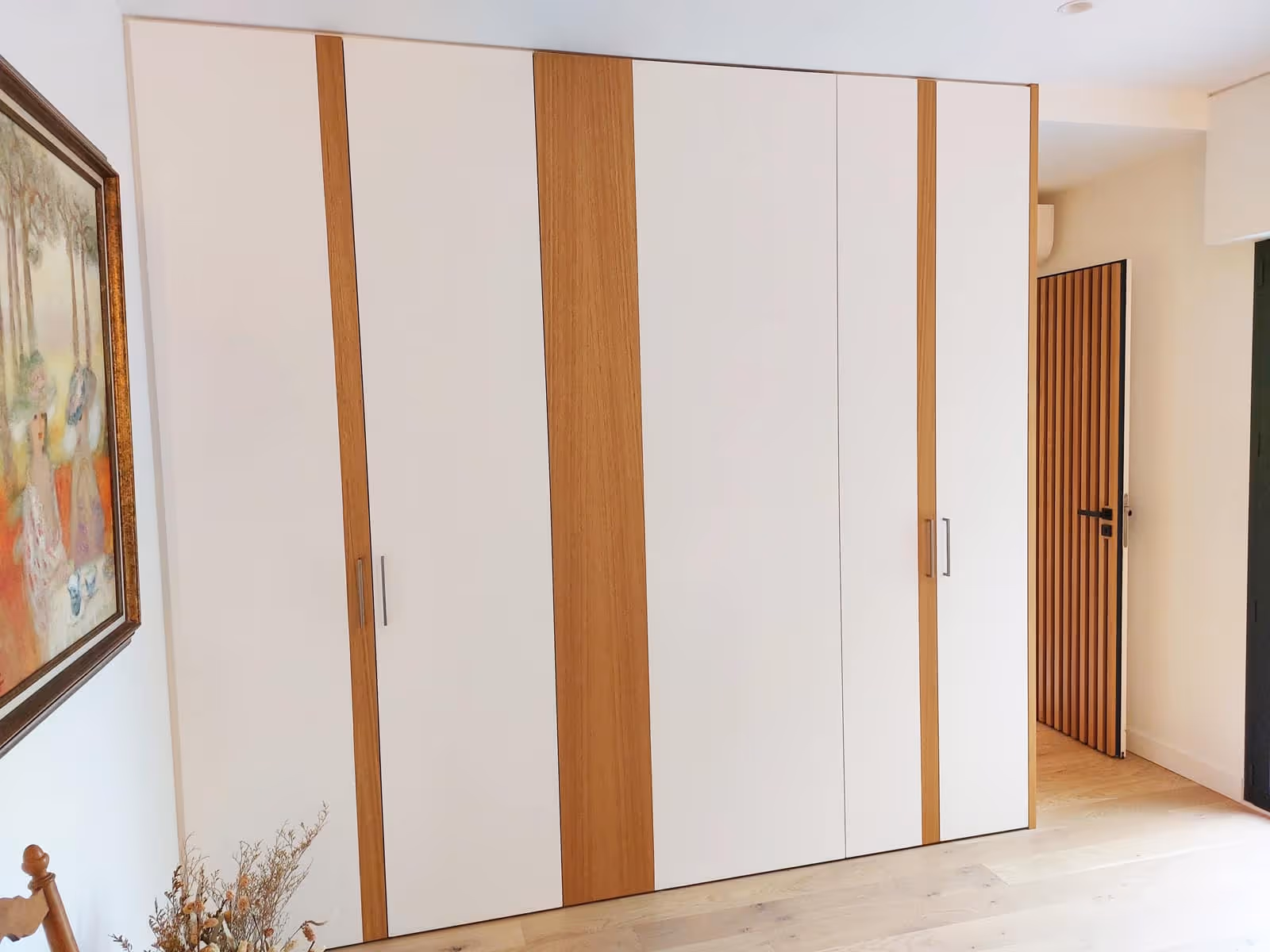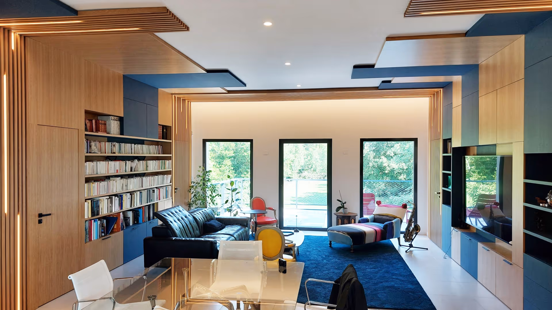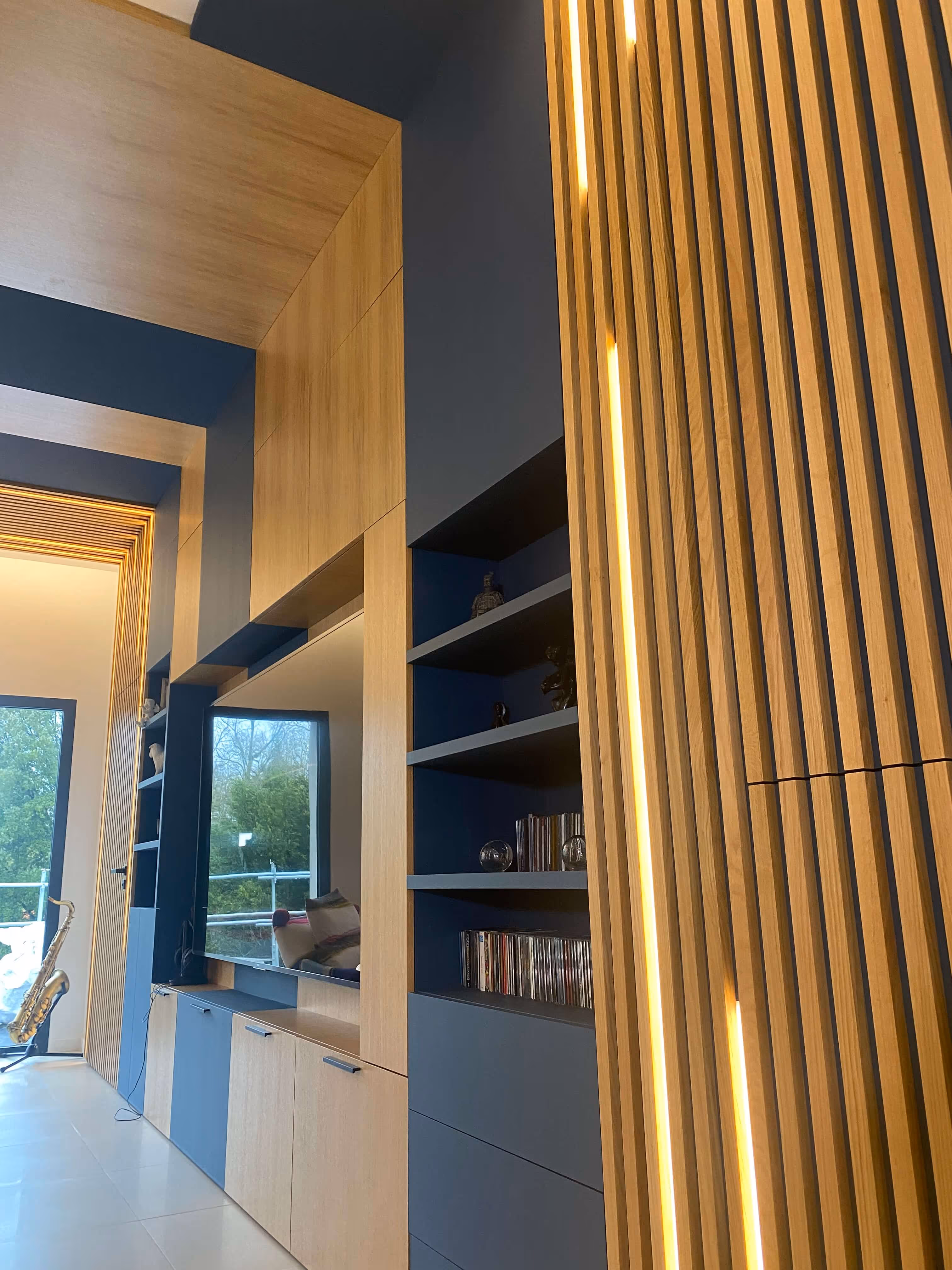 Les agencements complexes de ce beau projet de l'agence Mur Mur, nous ont permis de démontrer une nouvelle fois notre compétence en fabrication et mise en œuvre de placards, habillages muraux, bibliothèque en chêne vernis, éclairages LED encastrés.